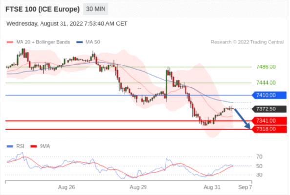 交易策略: 在 7410.00 之下,看跌,目标价位为 7341.00 ,然后为 7318.00 。