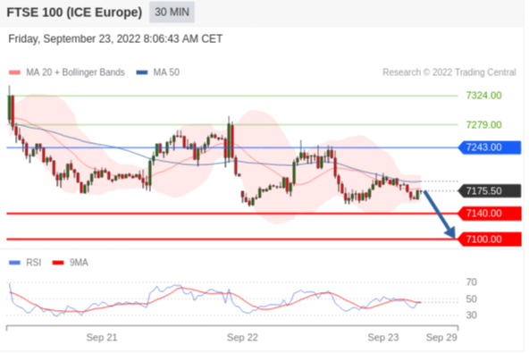 英国富时100指数期货 当日内交易策略: 在 7243.00 之下 目标价位为 7140.0(20220923