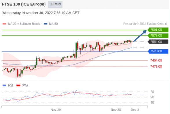 英国富时100指数期货 当日内交易策略: 在 7523.00 之上 目标价位为 7573.00(20221130)