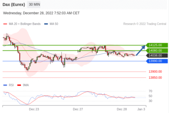 德国DAX指数期货 (Eurex) 当日内交易策略: 在 13990.00 之上 目标价位为 14080.00(20221228)