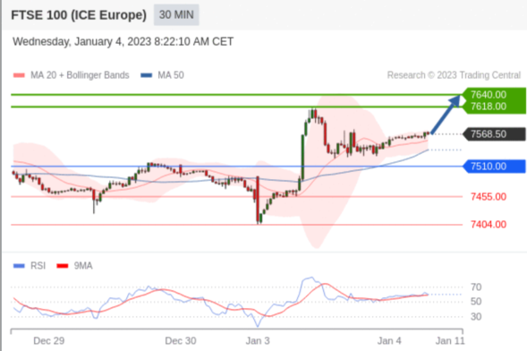 英国富时100指数期货 当日内交易策略: 在 7510.00 之上 目标价位为 7618.00(20230104)