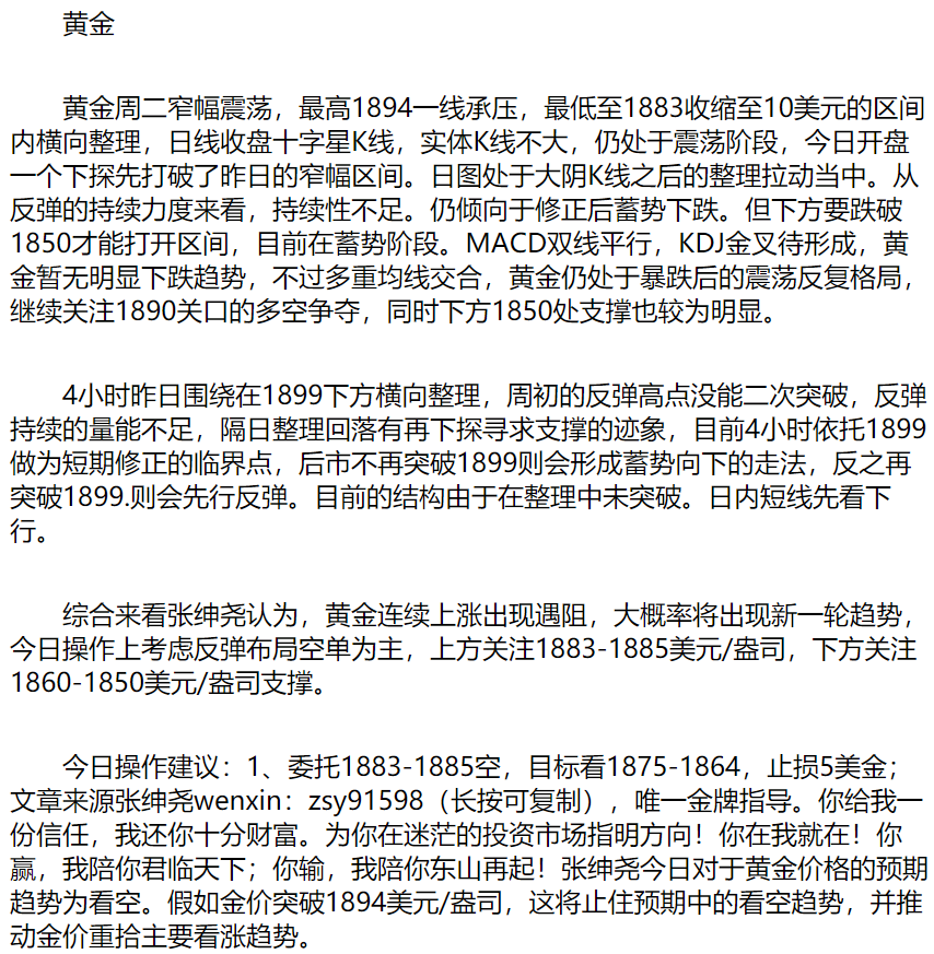 前言:每天行情波折不断,我所能做的就是用我多年的经验,带领各位投朋友走向市场前端,给你想要的帮助。合理规划资金进行投资,做到手中有粮、心中不慌,不带情绪化做单,切勿被利益冲昏头脑,盲目下单。顺势而为,取财有道,请永远不要和趋势作对。服务从未改变,责任常在心中指导全方位的分析,盯单,守盘服务;张