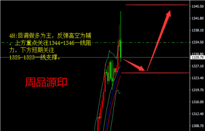 从技术面来看,上周五黄金以大阳柱收尾,布林带三轨大幅度开口向上扬,黄金运行在布林带上轨之外,若黄金继续保持这种强势的趋势上涨,那必然是不会有回撤的走势出现,今日黄金还有一涨,若出现回撤,那么修整之后在上涨,不过笔者周品源个人预计即便是要试探1334一线,也不再本周,只是本周适逢非农,不宜过分看