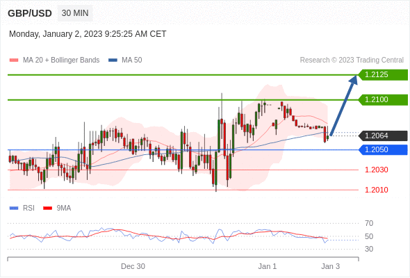 周一(1月2日)亚洲时段,英镑/美元最新报价1.2064,跌0.0026,跌幅0.22%。英镑系货币对整体技术效应较强,英镑汇率大概率会在2023年1月初走强,英镑对其他币种的货币对整体走强的概率达到70%。 英镑/美元汇率今日分析:在1.2050之上,看涨,目标价位为1.2100,然后为1.2125。在1.2050下,看