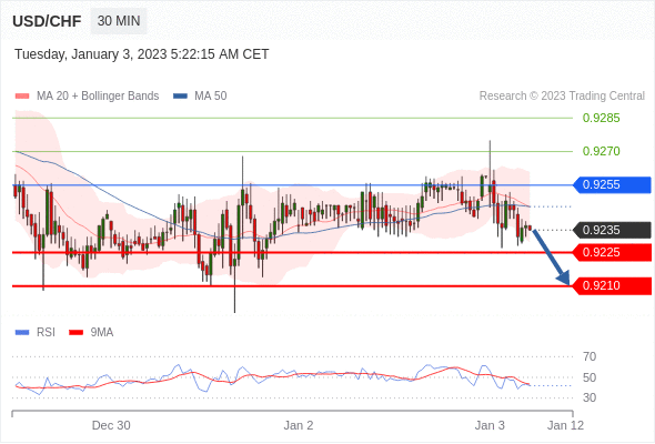 周二(1月3日)盘中,美元/瑞郎暂报0.9245,涨0.0003,涨幅0.03%。 美元/瑞郎汇率今日分析:在0.9255之下,看跌,目标价位为0.9225,然后为0.9210。在0.9255上,看涨,目标价位定在0.9270,然后为0.9285。 技术点评:跌破0.9225位置,将会引发下跌至0.9210。 阻力位