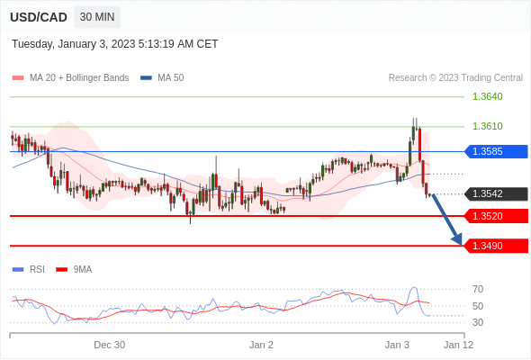 周二(1月3日)盘中,美元/加元暂报1.3561,跌0.0014,跌幅0.10%。 美元/加元汇率今日分析:在1.3585之下,看跌,目标价位为1.3520,然后为1.3490。在1.3585上,看涨,目标价位定在1.3610,然后为1.3640。 技术点评:RI技术指标呈现继续下降趋势。 阻力位:1.35201