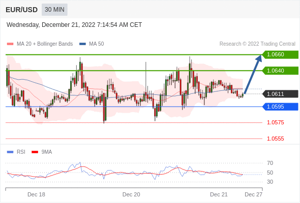 周三(12月21日)亚盘,欧元/美元上涨,暂报1.0625,涨幅0.04%;美元/日元探底回升,暂报132.15,涨幅0.40%。 欧元兑美元汇率分析 在1.0595之上,看涨,目标价位为1.0640,然后为1.0660。在1.0595下,看空,目标价位定在1.0575,然后为1.0555。 技术点评:RI技术指标缺乏下降动能。