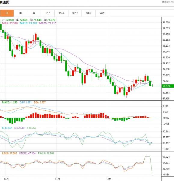 2024年,原油市场将面临供应过剩、需求增长放缓以及中东紧张局势可能引发的价格波动的挑战。机构预测,2024年布伦特原油平均价格将在每桶84.43美元。 今日原油价格技术分析: 原油昨日中阴线收低,连跌两日,已经将周初的上涨中阳线的空间尽数回吐;4小时上,隔日原油走震荡下行走势不断下跌,当