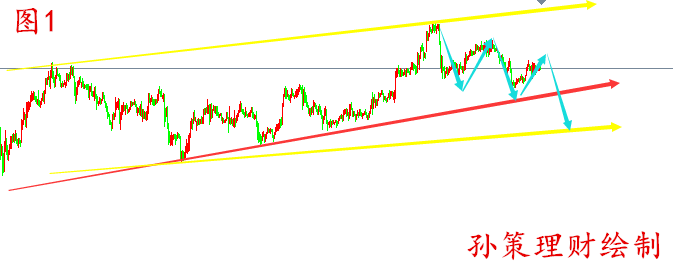 黄金一周结束后,孙策老师认为明显是调整市,我列的两种可能是我认为最大概率的两种,其实还有其他的,我觉得无意义,大家看一下。 第一种:没有跌完,跌破1717本周低点应该会继续向下加速到1713-1705一线,那时候孙策老师更倾向于会运行图1黄色通道下沿线1693-1695左右。 1、跌破1717之后考虑轻仓