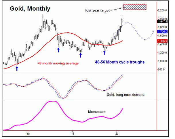 1.中期走势上,黄金在4年周期上依然处于比较明显的上行趋势中,在触及重要的目标/转折点之前,不太会出现趋势性质的逆转。从时间角度来看,这样一波行情会持续到明年,很有可能到2021年末才会结束。 2.在价格层面,2212-2340的区域在未来数月将被触及,310天周期也匹配这一价格水平。在这个级别上的时间节点