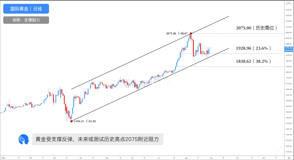 【黄金行情回顾】 上周五(8月28日)金价再次来到1976美元高位,其主要原因是中美方面的关系再次令市场紧张,当下推动黄金上涨的主要逻辑是通胀,但随着鲍威尔在央行大会讲话结束以及美国政府新一轮刺激法案推迟,黄金近期涨势受助,但从长远的角度来看中美关系仍是潜在推动黄金上涨的主要原因,后续投资者需要重点持续关