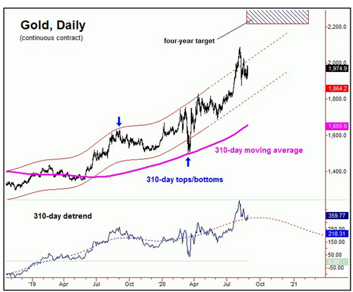 中期走势上,黄金的连续调整正在进行中,之前一波快速下跌是第一轮,但从2089开始的调整整体上依然是逆主趋势的。如果从波浪理论来看的话,目前处于第四浪的修正中,未来数月才会完成第五浪。 310天周期上匹配的是中期趋势,这将给出中期显著回落的周期及潜在顶点。价格目前的预估依然在2212-2340.56一线,达成的可能