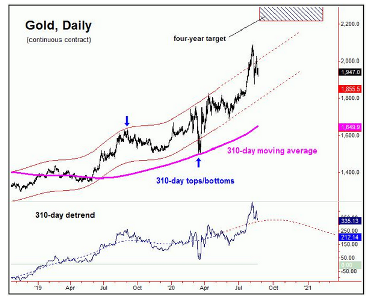 一、中期趋势并未显著改变 黄金上周先涨后跌,整体呈现回调态势。不过和过去几周所言一样,中期走势并未出现显著改变。至今年年末的大行情上,依旧是看涨为主。310天周期顶部完成之后,黄金才会形成新一个大级别的调整。而这一周期的通道底部则是中期支撑,目前来看测试支撑的可能性很低。多头目标2212-2340.56最终可以