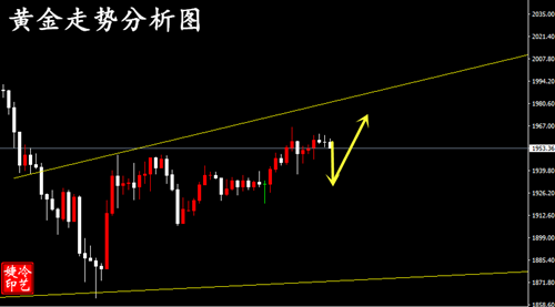 黄金日图收盘大阳线,收稳区间破高口。短线反弹得到延续,今日周线收官之作,继续看反弹向上。周初的弱势已被昨天的反弹改变,空间反弹大。形态上有二次的破高向上。今日将震荡区间上移至1945-19851993. 4小时以时间换空间整理蓄势强势站上第一波反弹高点1950上方,隔日开盘在此位之下。短线图相对走得偏
