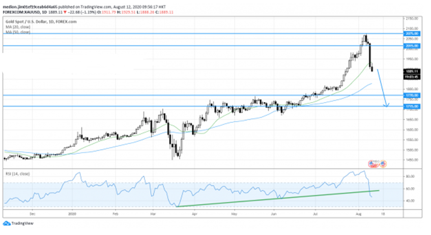 周三(8月12日)亚市午后,现货黄金继续承压,此前一度暴跌至1862美元,较日高1929美元大跌超65美元。 4小时图来看,最后的心理防线200期均线——1872美元已经被跌破,短线来看在1800美元之前几乎没有强劲支撑。 针对黄金的前景表现,Forx.co撰文进行简要分析,内容如下: 黄金现货价格昨天暴跌115美元,或5.70%,至