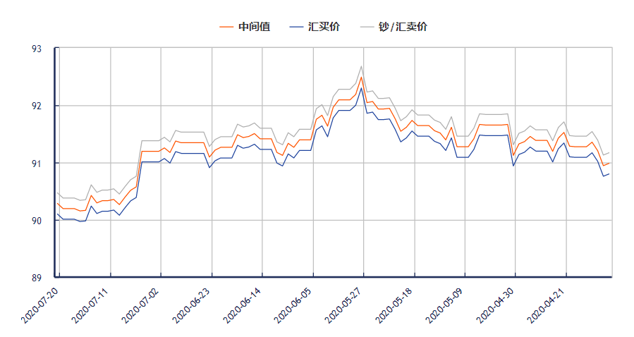 港币兑换人民币汇率(2020年7月20日) 类别 汇买价 钞/汇卖价 中间价 更新时间 港币兑换人民币汇率 90.08 90.44