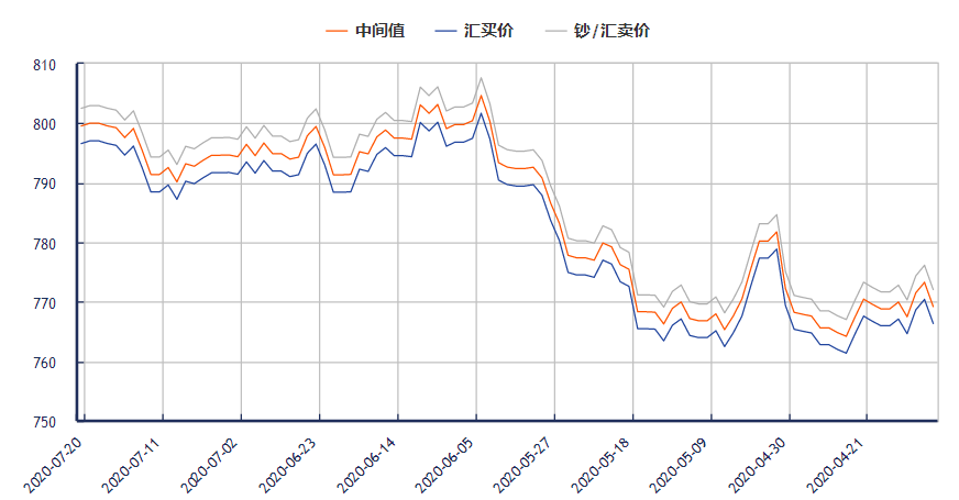 欧元兑换人民币汇率(2020年7月20日) 类别 汇买价 汇卖价 中间价 更新时间 欧元兑换人民币汇率 796.6 802.47