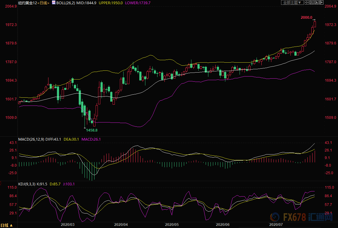 周二(7月28日)现货黄金持续刷新纪录高位,最高触及1981.17美元,COX黄金期货12月合约价格飙升,触及2000美元/盎司,再次刷新历史记录高点,涨幅约2.28%。不过因近期过快的涨势黄金在刷新纪录高位后出现小幅的获利抛盘,现报1969.72美元,跌幅1.42%。 周一因更多的迹象显示疫情蔓延部分国家和地区正在实施第二轮封锁