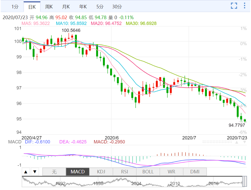 周三(7月22日)美元指数连续第四个交易日下跌,盘中一度低见3月以来最低94.82;欧元兑美元触及2018年10月来最高1.1601;商品货币也走高,因在欧盟领导人于周二达成财政刺激协议后,冒险操作仍在继续。瑞郎兑美元领涨,瑞郎因金价上涨至近九年来最高而受益;美元兑瑞郎一度跌0.5%,至3月10日以来最低点,而黄金延续升势至2