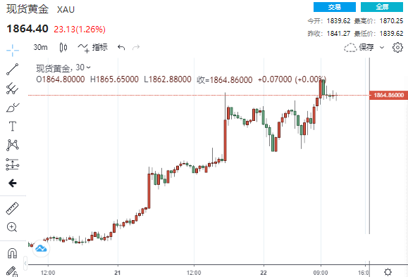 周四(7月23日)现货黄金冲高回落,盘中续刷9年高位至1876.61美元,现报1866.03美元,跌幅0.24%。 周三因为疫情蔓延和国际担忧情绪升温,推动黄金继续走高,并在周四早盘续刷9年高位,进一步逼近1900美元关口。同时市场押注美元进一步走低的预期升温,且数据显示美国失业人数再度出现回升的迹象,这都支撑金价走高。