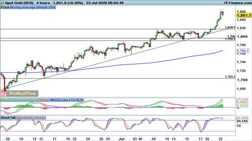 周三(7月23日)亚市盘中,现货黄金继续徘徊在1870关口附近,维持在多年高位附近。 针对日内黄金走势,FXtrt分析师Ailachal撰文进行简要分析,内容如下: 随着美国和中国之间地缘政治紧张局势的升级,加上美国援助计划的不确定性,黄金多头势不可挡地接近2011年9月以来的最高水平。 推动黄金价