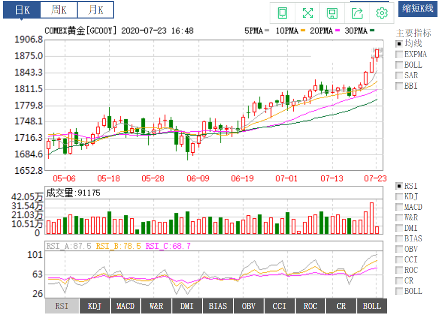 黄金最新消息 上海黄金交易所黄金T+D早盘盘初上涨0.74%,报411.9元/克; 截止7月23日下午,现货黄金盘中突破日第三阻力位1884.20,现报1885.97美元/盎司,日内涨幅扩大至0.8%. 在欧盟同意设立7,500亿欧元复苏基金以分担疫情危机期间产生的债务后,市场人气基本保持乐观。 此前,国际货币基金组织(IF)在评