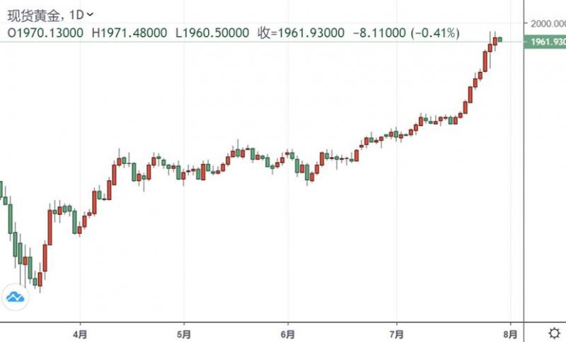 周四(7月30日)亚市盘中,因美元展开反弹,现货黄金价格回落,金价目前位于1963美元/盎司附近,由于美联储维持鸽派货币政策立场,周三现货黄金走高,盘中一度突破1980美元/盎司关口。北京时间周四晚间,投资者将迎来美国第二季度GD数据,预计美国二季度经济萎缩幅度将达到近35%,创下历史最高纪录,一旦美国第二季度GD