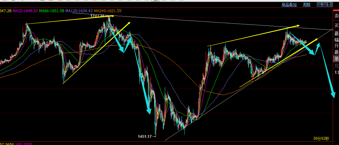 郑氏点银:黄金三角缩口整理待破位,原油19依旧是关键 昨日价格整体处于震荡下跌横盘短期修正对待,欧美盘符合思路卡在1726-1708区间内整理,包括现在依旧还在酝酿,料想欧美盘应该会有所突破,个人依旧倾向于下跌打开进一步的深度调整,下面具体来解读下:第一,周线级别周初强调1730是上行通道的