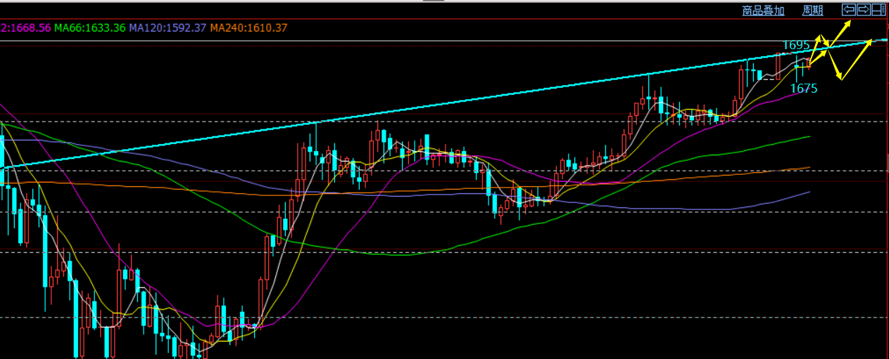 郑氏点银:黄金1709上继续做多,原油24下保持偏弱 昨日黄金走势又一次发生循环的横盘拉升,几乎每次高位横盘都是为破高做准备,不过今日开始恐怕变得相当复杂,因为价格破了1704前高,逐步拉升,看似日线和周线连阳强势,就担心一点:市场一边倒集体看涨,反而物极必反;从今日亚盘走势就开始显露,价格