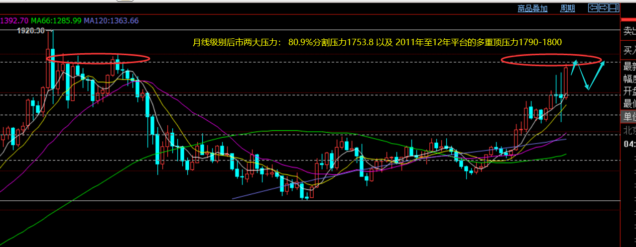 郑氏点银:黄金1710上偏强运行,原油19上压力较大(周评) 黄金月线图分析:月线代表长期方向,如图可以清晰见到,目前维持趋势多头不改变,价格依托短期均线5日和10日逐步上拉破高,多头排列,3月份出现的调整只是刺破10日,不影响整体的多头上攻,那么后市上方关注两大压力点,一个是80.9%分割位置1