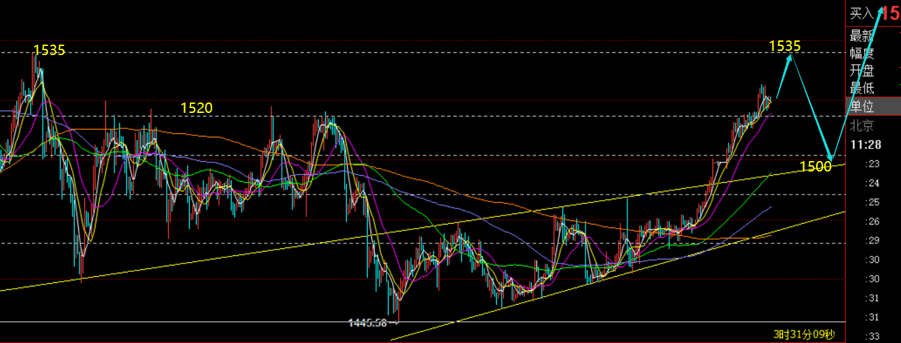 郑氏点银:黄金1514上逢低跟多,原油61逢低多 黄金高位1515-1507区间整理后依旧无法压制下滑去确认前期的突破口,技术上回测不到位,今日早间中东局势升温,避险刺激冲破了1520前压制高点,那么后市就算打压下行调整,空间也不会太大,原本预期极限调整至1488,目前看来希望渺小,把调整的极限位置