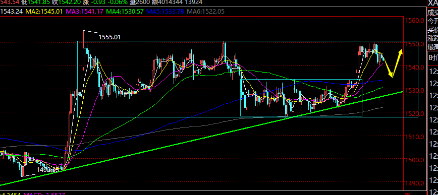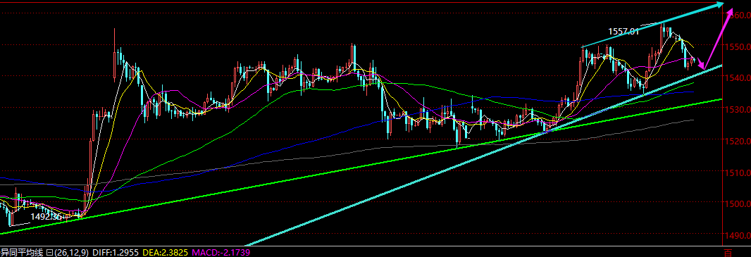 郑氏点银:金银继续偏强上涨,原油步入宽幅反复洗盘 昨日亚欧盘走势震荡下调,显得疲惫,但美盘避险刺激直接反转走强,这就是大趋势多头的好处,最高突破了前期高点,拉升郑1557,可惜今日早间受贸易战缓解,短线刺激急跌下滑,并未守住1550关口,而下方1540-1541趋势支撑就比较关键的位置,守住
