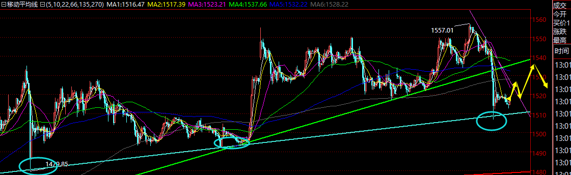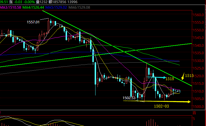 郑氏点银:金银即将考验多头的最后防守,原油短期走强 昨日早盘依托上周五低点1502迎来一波反弹,冲击1512平台阻力点,随后欧盘压制此阻力下滑试探了1504后再度反抽,美盘突破了1512,但好景不长,两三个小时后压制1515迎来夜间的弱势下探,破位了1505关键趋势支撑,半夜反抽确认1505后继续连跌向