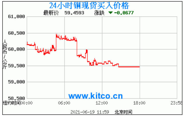 铜价格走势图今日最新铜价行情(2021年6月21日) 今日最新铜价:59.4593涨跌:-0.0677 备注:以上铜价格仅供参考,请以官方价格为准。