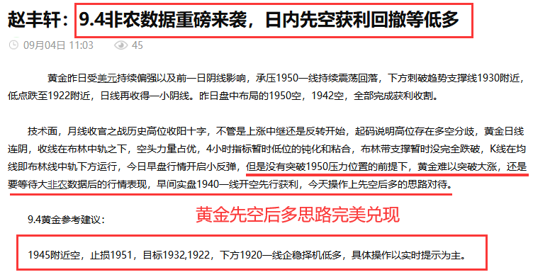 今天非农完美获利收官,我们实盘多空均有收获,1940空,1926多,1920多全部获利收割,晚间非农数据公布,黄金先是借助数据进行冲高之后迅猛下跌,行情依然还是处在区间震荡反复之中。 黄金目前行情来看,再次回到1920-30区间,预计晚间金价下跌的空间已经比较小了,1916有可能就是今日的低点,综