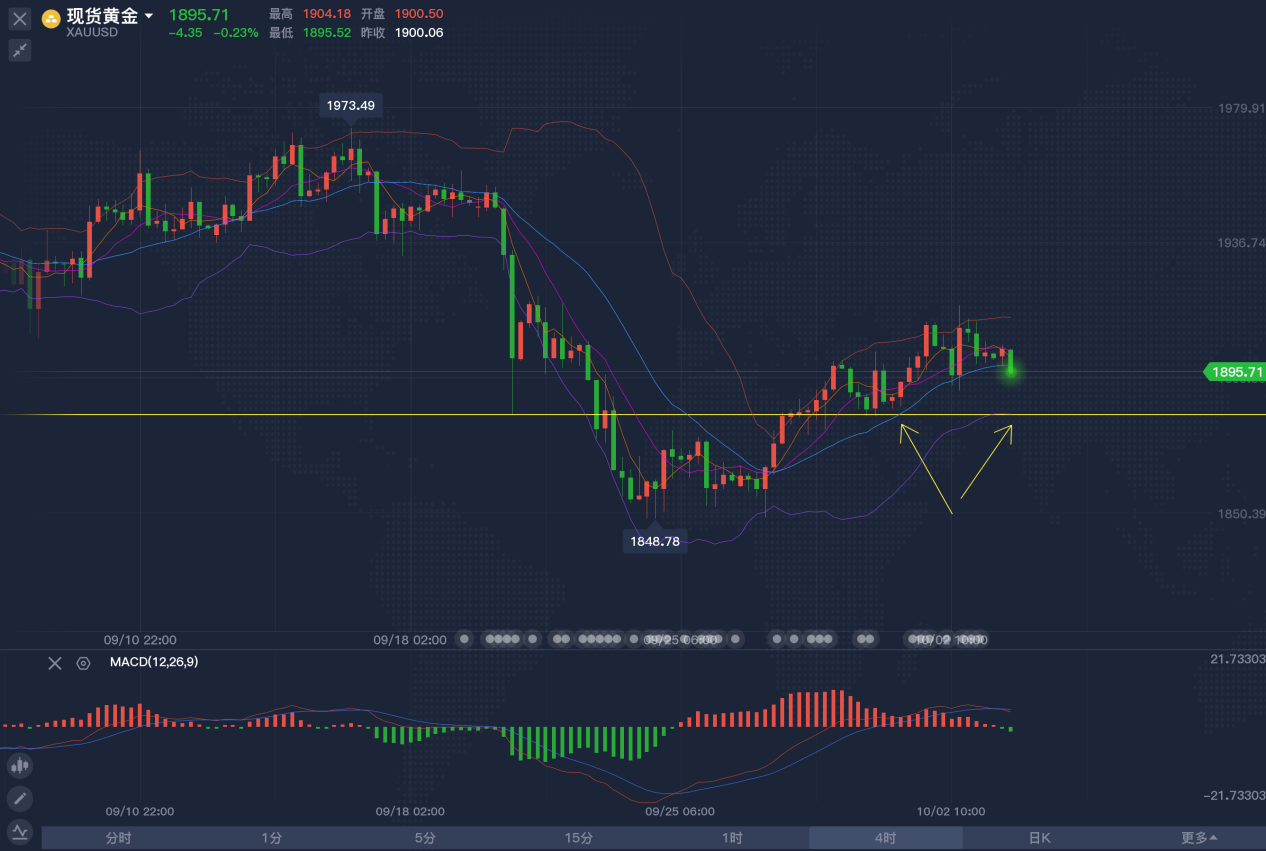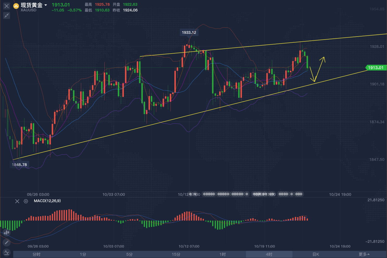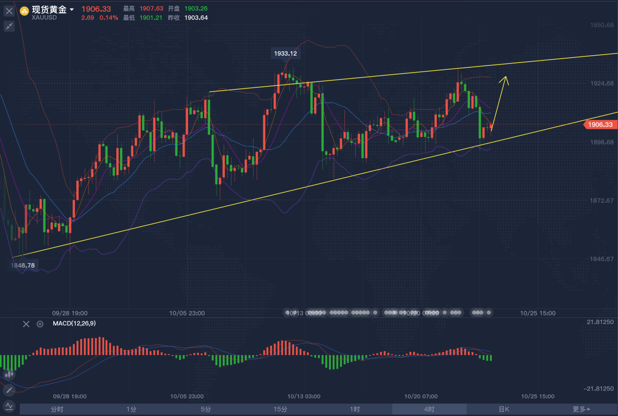 鈥A533周一,金价延续了一波向上的反弹,向上第三次冲击1913美元/盎司,不过这一次同样也是没有冲过,受到美元指数的反弹,美盘时段金价自1918这个高点的位置持续回落,一直到早上最低点1894美元。 这一次,基本上还是没有打破原有的震荡行情,在整个行情的交易当中,继续维持着箱体震荡,美元虽然反弹