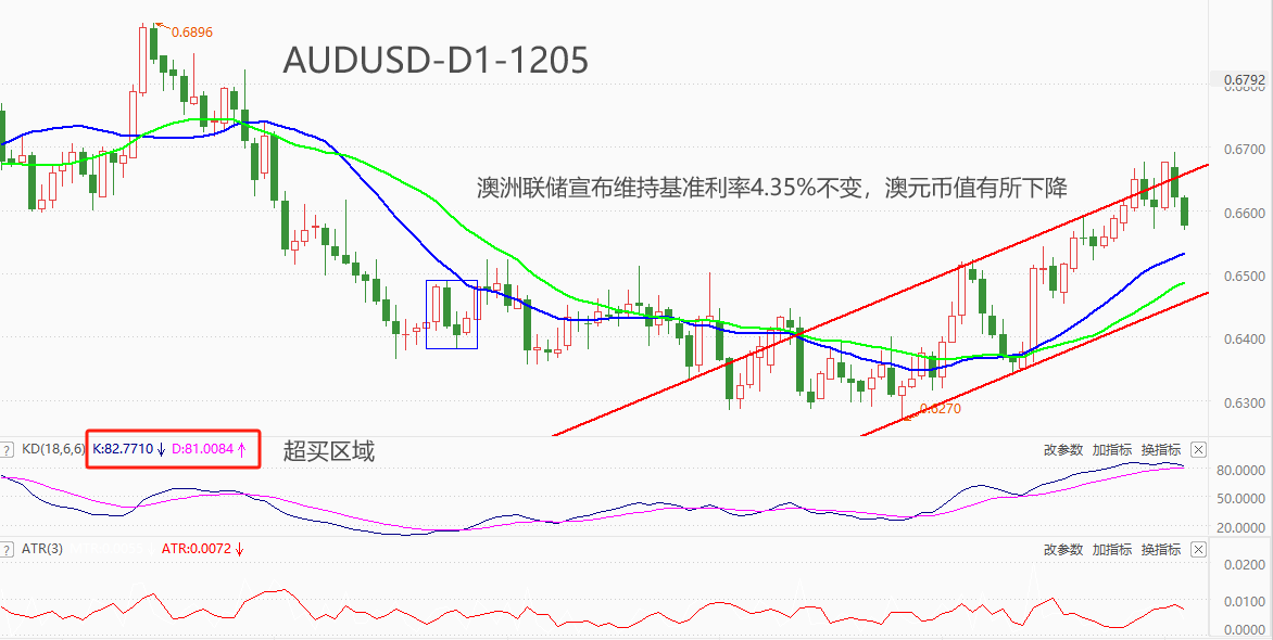 ATFX汇市:澳洲联储12月决议维持基准利率不变,AUDUD短线大跌 ATFX汇市:12月5日,澳洲联储利率决议结果显示,将现金利率目标维持在4.35%不变外汇结算余额的支付利率维持在4.25%不变,符合市场预期。政策声明中提到:更加确定通货膨胀将会在合理的时间内返回目标;劳动力市场状况也继续逐步缓解,但仍然紧张。综合来看
