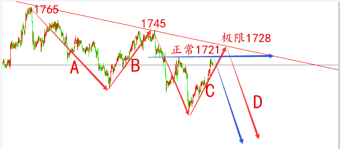 3、如果1721是D浪的高点后,那么后续的操作短线尽量反弹空,多单暂时回避,中线直接把止损带到1721上方(极限1726)目标拿到1705/1700/1695这里应该是问题不大。(中线要去试仓,先给大家说明,不要直接利用半仓或者重仓去操作,否则风险自担)很多同学可能试仓位完全没有概念,那么我今天再讲一下,就拿我来说,我自己操作前都会任性地试仓,但是试仓的仓位会特别特别小,我一周要试仓很多次,也会损掉很多次,但也有很多次的试仓成为我波段单的首仓,也就是开头单,一次成功的交易我会捞回很多试仓失败的小单,主要还是仓位问题。盘间行情实时变换具体操作黄金、原油、解套、走势分析、操作建议、在线喊单以【孙策理财官微sclc415】实盘为准