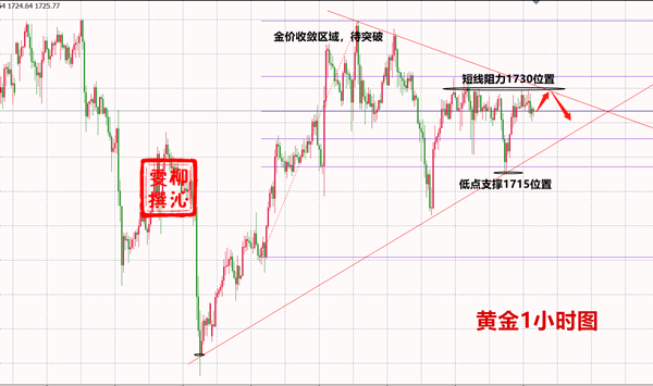 鉴于基本面支撑多头,技术面看调整,有一些矛盾;技术面服从基本面,那么我们不追涨,逢低买;关注1720以及1715-10区域支撑买多,目标关注1730~33突破,破位短线加仓再看10美金;然后关注1745-50区域压制做空,目标30-50美金。