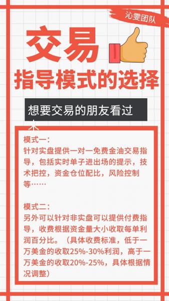 针对实盘提供一对一免费金油交易指导,包括实时单子进出场的提示,技术把控,资金仓位配比,风险控制等……有需要可以加入实盘指导。另外可以针对非实盘可以提供付费指导,收费根据资金量大小收取每单利润百分比,有需要可以具体了解。(具体收费标准,低于一万美金的收取25%-30%利润,高于一万美金的收取20%-25%,具体根据情况调整)