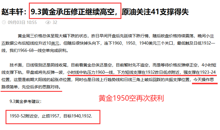 黄金今天1950空,午后如预期下行1927一线获利,昨日黄金反复震荡之后冲高回落,跌破1959美元支撑进一步下跌,尾盘持续弱势最低下跌触及到了1932美元一线,日线收阴线,今天早间博文分析也是给出做空的思路,午后下跌1927一线获利收割,实力全网都见证。