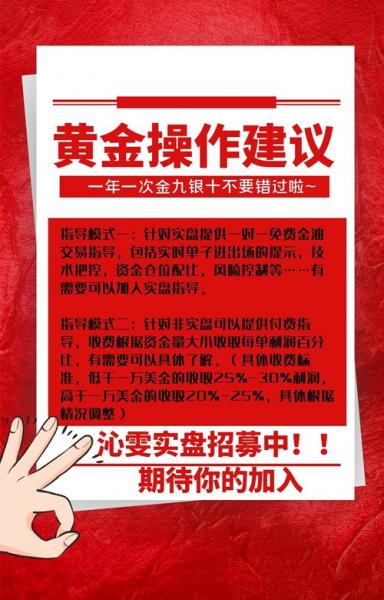 针对实盘提供一对一免费金油交易指导,包括实时单子进出场的提示,技术把控,资金仓位配比,风险控制等……有需要可以加入实盘指导。另外可以针对非实盘可以提供付费指导,收费根据资金量大小收取每单利润百分比,有需要可以具体了解。