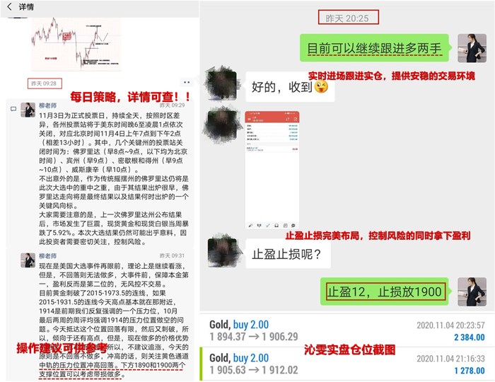 我想,这周大选正在如火如荼的进行,隔着屏幕都能够感觉到市场的紧张,交易需要谨慎谨慎再谨慎,因此我们周三的交易就进场的比较晚,但是盈利还是有的。午后金价回撤至下方1890成功企稳后顺势在1894布局多单,晚间在1906成功利出;第二单节奏比较快,回撤1905继续二次跟进多单进场,而后金价自动止盈在1912一线。