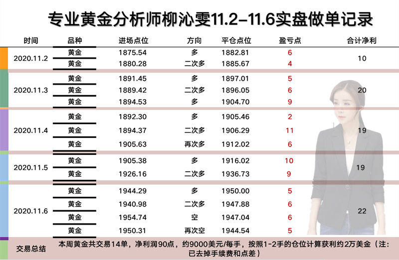 柳沁雯11.8黄金周盈利90美金,黄金下周再次力挽狂澜收获盈利