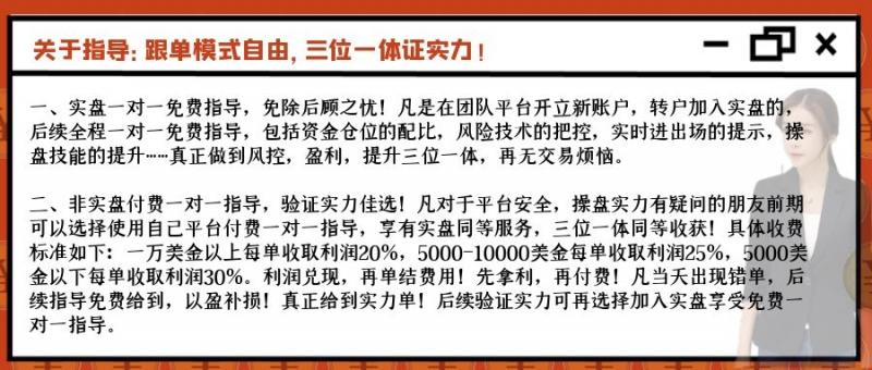 二、非实盘付费一对一指导,验证实力佳选!凡对于平台安全,操盘实力有疑问的朋友前期可以选择使用自己平台付费一对一指导,享有实盘同等服务,三位一体同等收获!具体收费标准如下:一万美金以上每单收取利润20%,5000-10000美金每单收取利润25%,5000美金以下每单收取利润30%。利润兑现,再单结费用!先拿利,再付费!凡当天出现错单,后续指导免费给到,以盈补损!真正给到实力单!后续验证实力可再选择加入实盘享受免费一对一指导。
