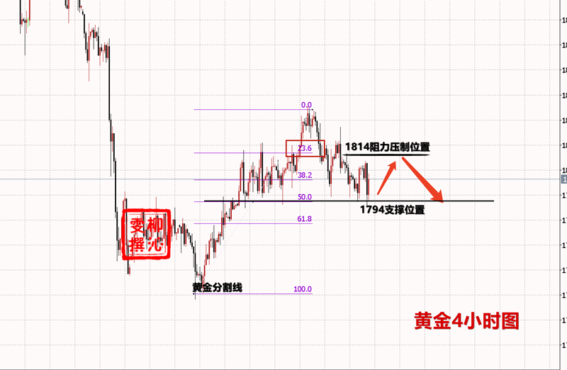 金价上方阻力,关注前高1814美元附近,这是0.236黄金分割线位置,若金价上涨突破,继续关注前高1824美元,以及1833美元附近。