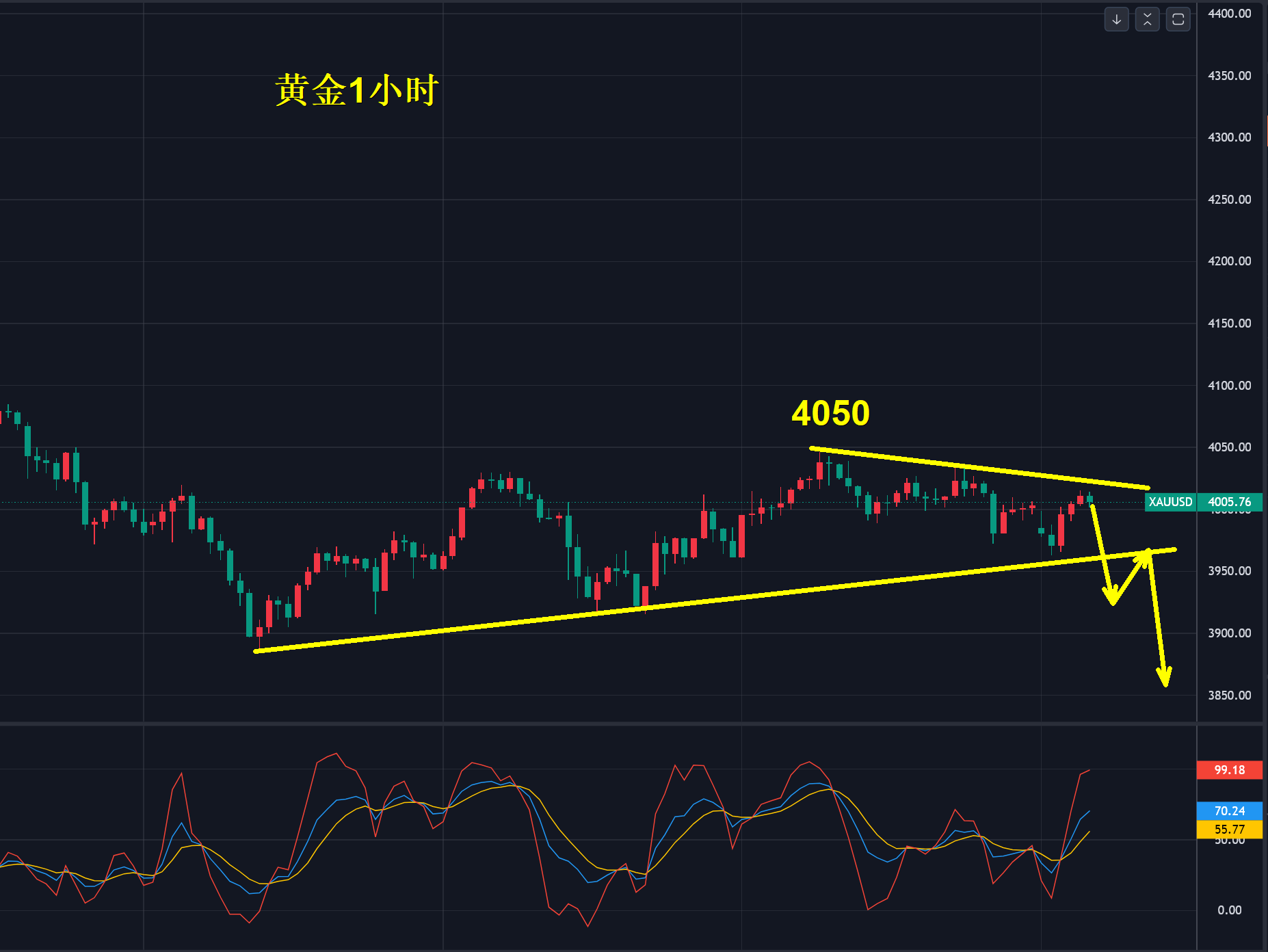 目前,金价反复以4000美元为中轴来回洗盘,上周五冲高4036美元后又回到3960美元,收敛三角形震荡突破后选择方向,只要4050-60美元没有破位调整就没有结束,只有再跌一波才能让短期追多者冷静,那个时候往往是出手的好机会。