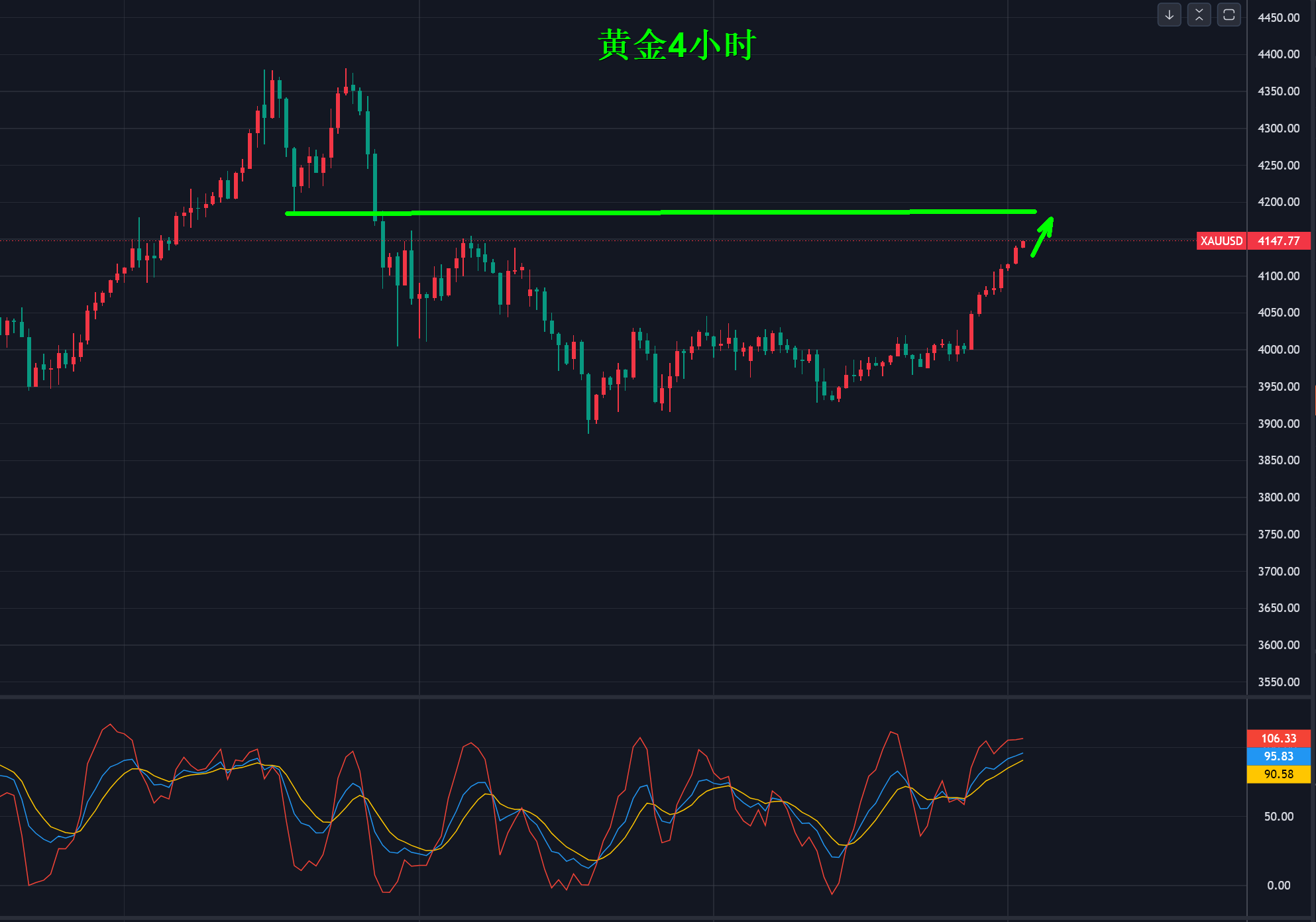 4小时级别持续连阳上涨,中途回调只是修正,这种行情相对比较好做,中途没有太大的波动,上涨之后的首要压力在4180美元,这里是前期4380双顶后回踩关键性压力位。