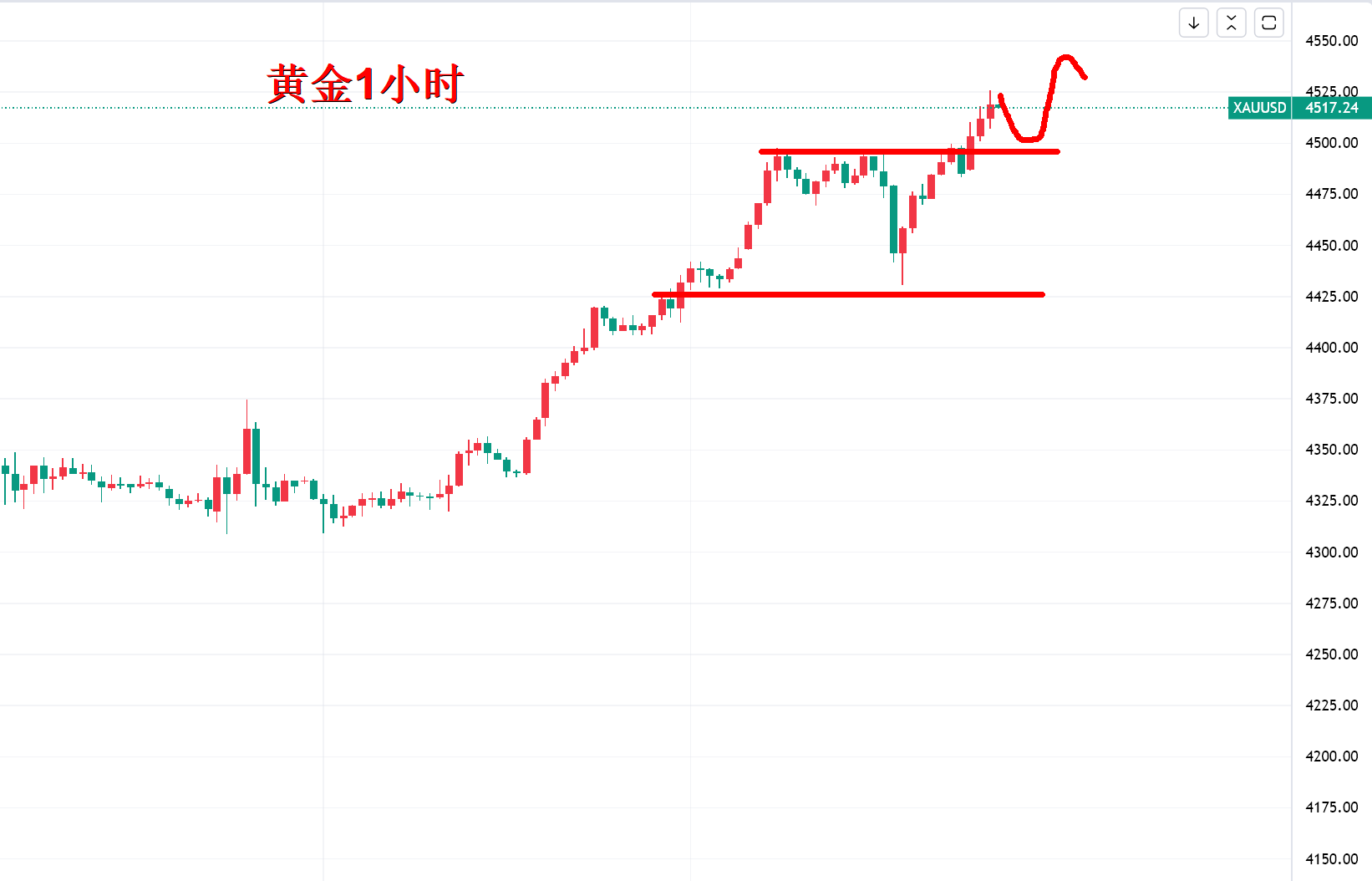 凌晨金价快速下探至4330美元,V型反转上演强势反扑,4500美元突破后从阻力变成了支撑,今天回落靠近此位置再多,不考虑去追,亚盘的上涨一定要看欧盘的强弱,4500-4490美元确认后向上才能更顺畅,或美盘前亚欧盘延续后回调诱空也是上车的机会。