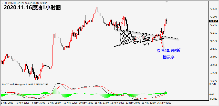 MODERNA公司疫苗的消息提振,价格直接突破42美元。有关疫苗落地的消息利好商品资产,对于原油同样起到利好作用。明日欧佩克+技术监督委员会召开会议,而11月30日至12月1日欧佩克+扩大会议将决定原油具体的减产情况。今日原油已经成功把握原油的多头,在低位40.9附近的多,已经获利120美元,晚盘已经没有合适的位置,等待明日的机会。